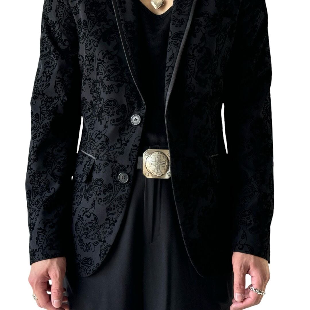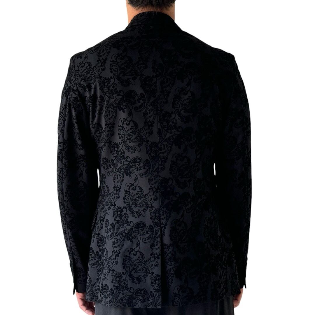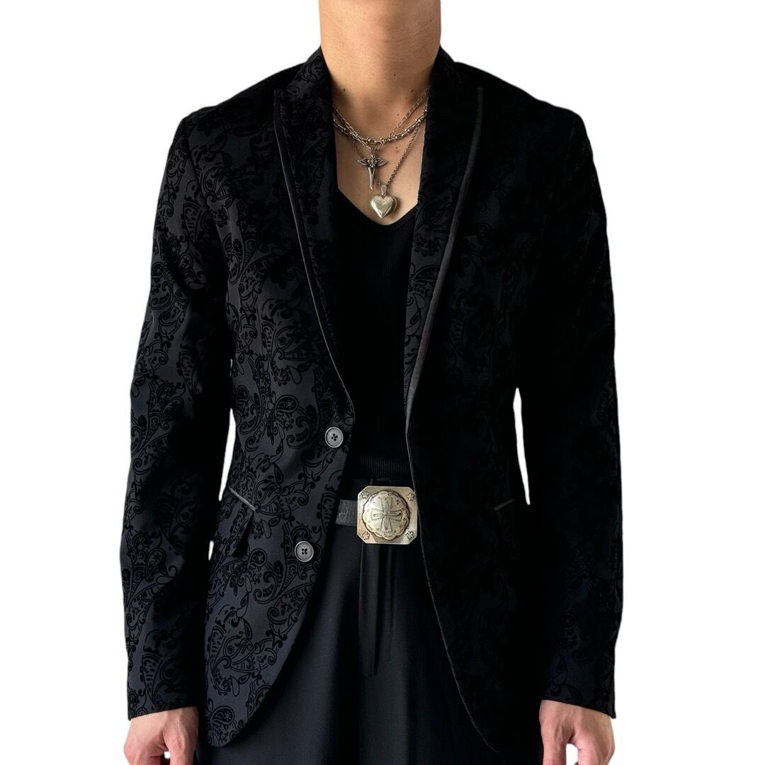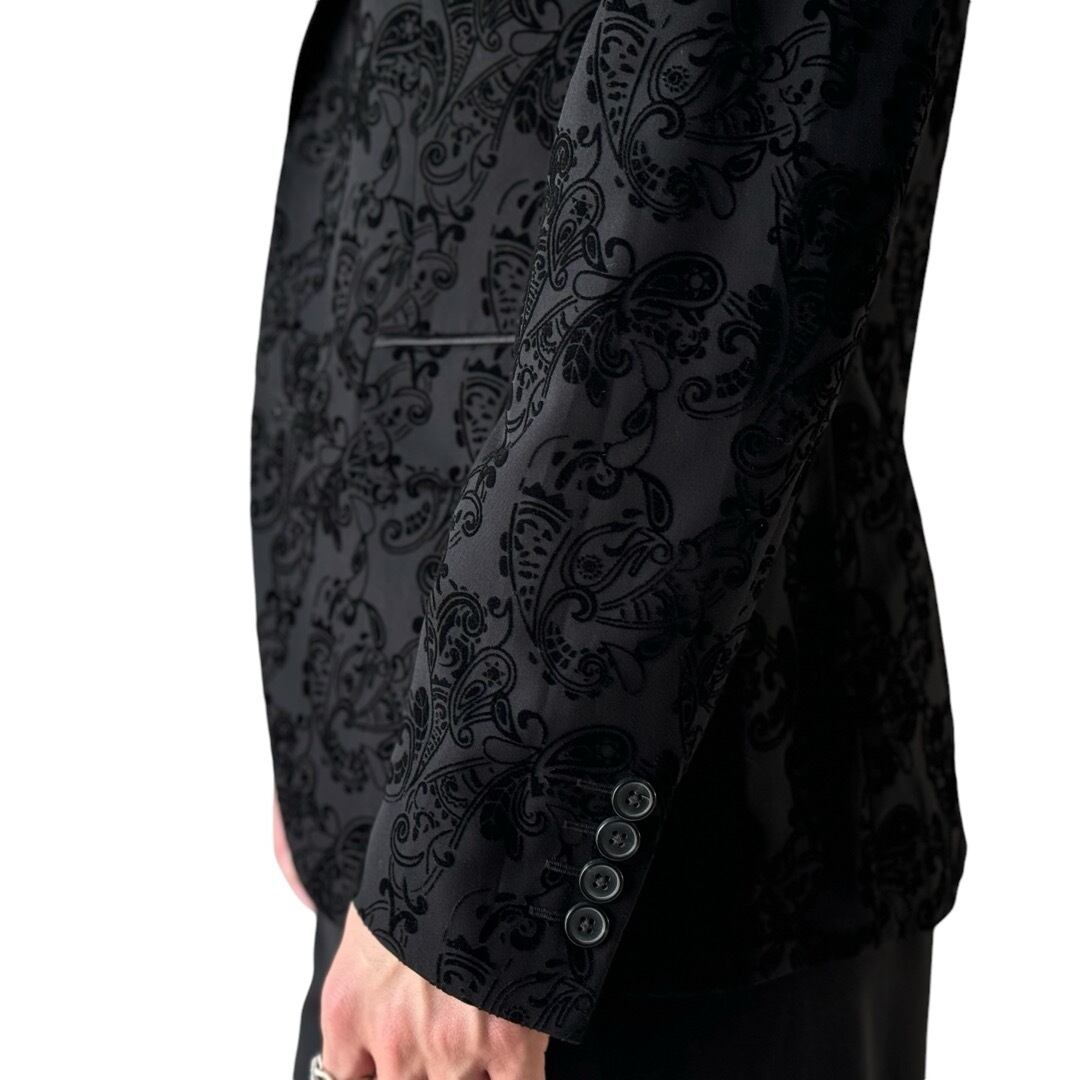 フロッキープリント加工でブラックペイズリーが全体に施されたブランドライクなデザインが超モードな2bエレガントジャケット。