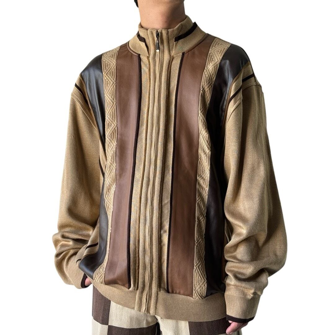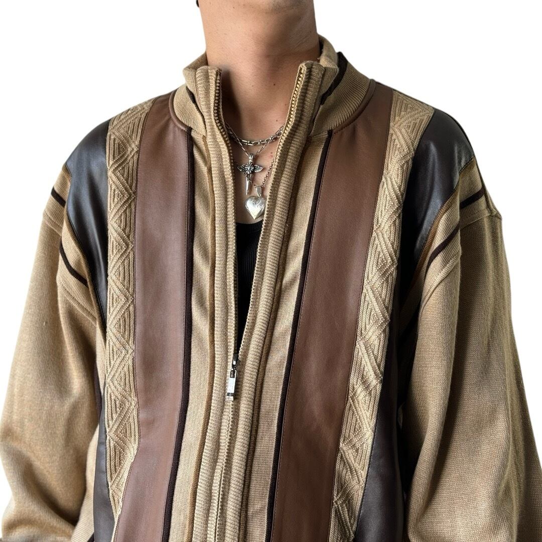 フロントをざっくりレザーでスウィッチングしたハイクオリティなデザインのコンビネーションニット。