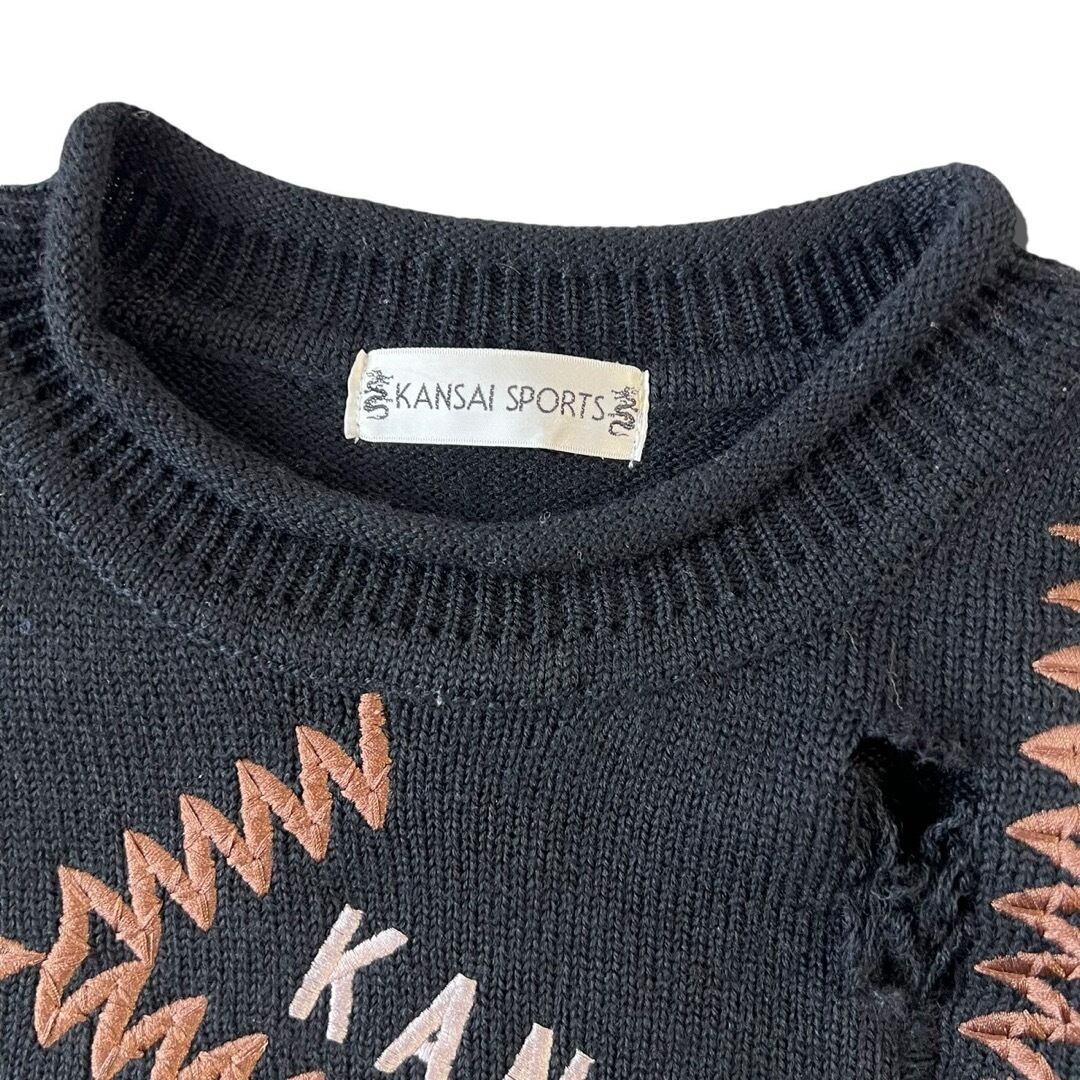 【90s KANSAI SPORTS】 Embroidery Patchwork Roll Neck Distressed knit
