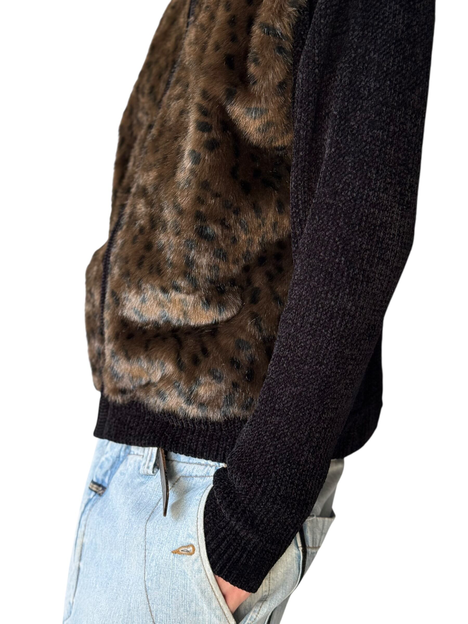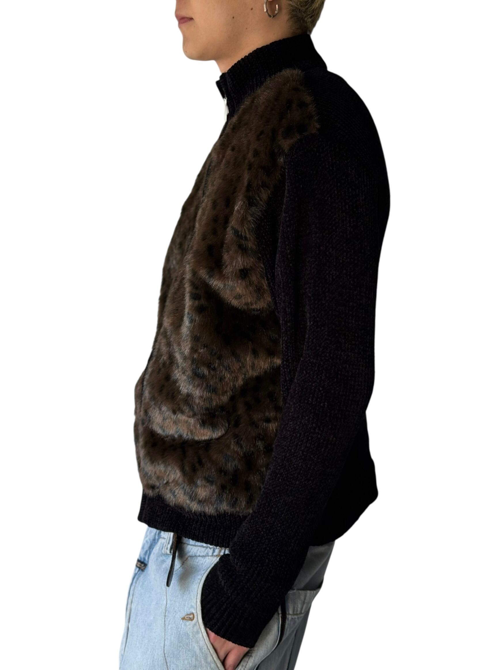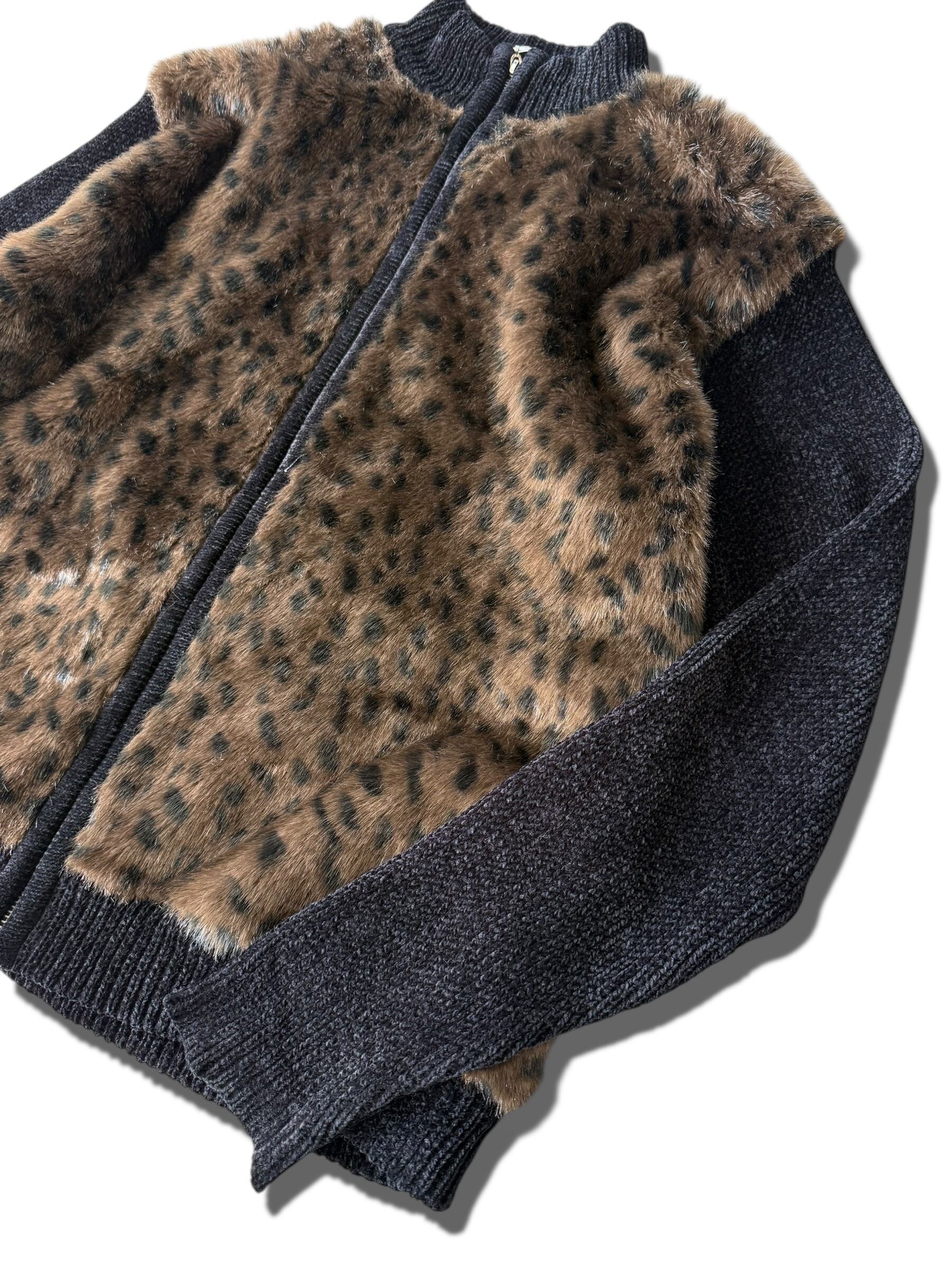 【Lisa international】Animal pattern Fur swiching Zipup knit
