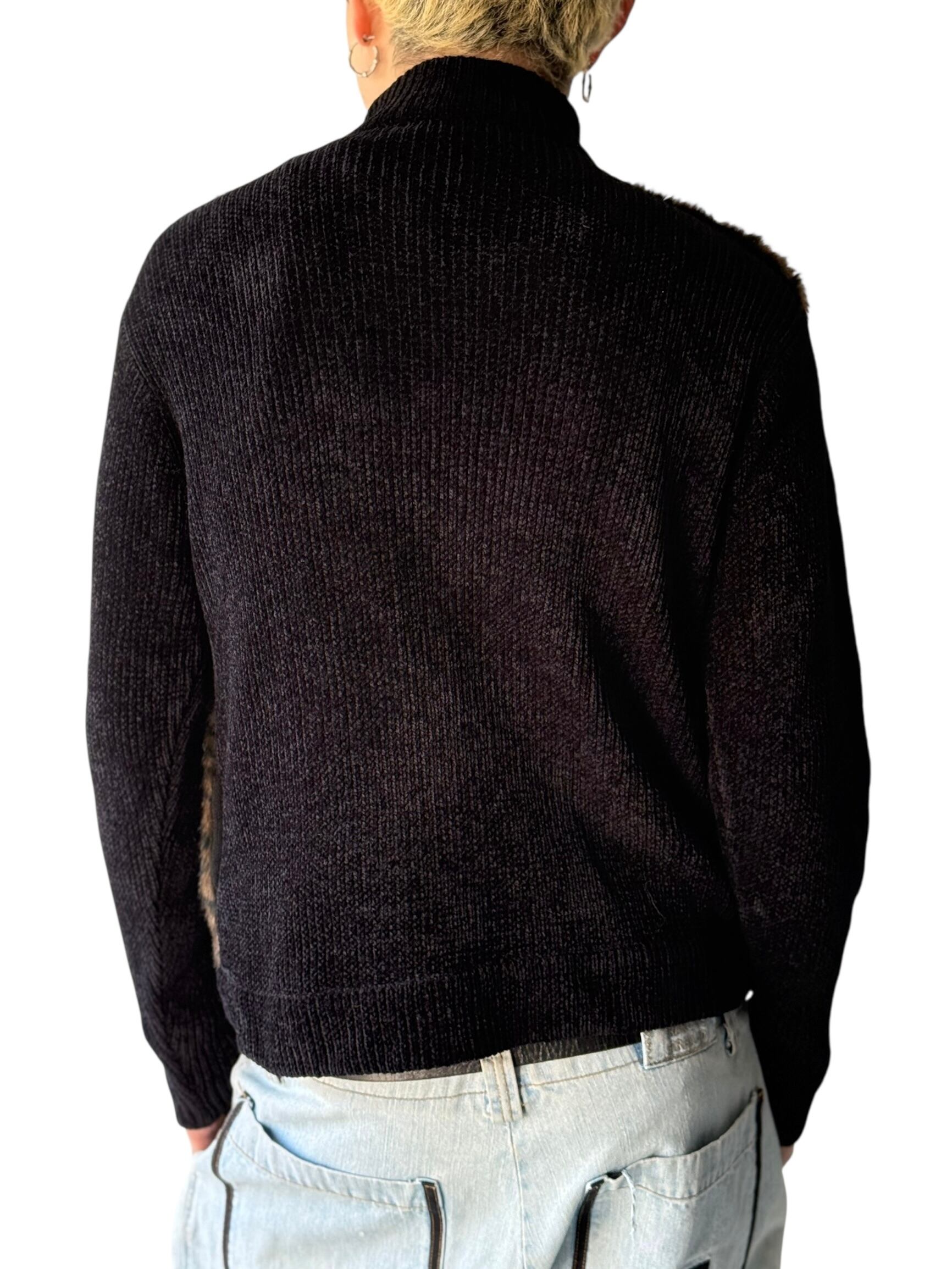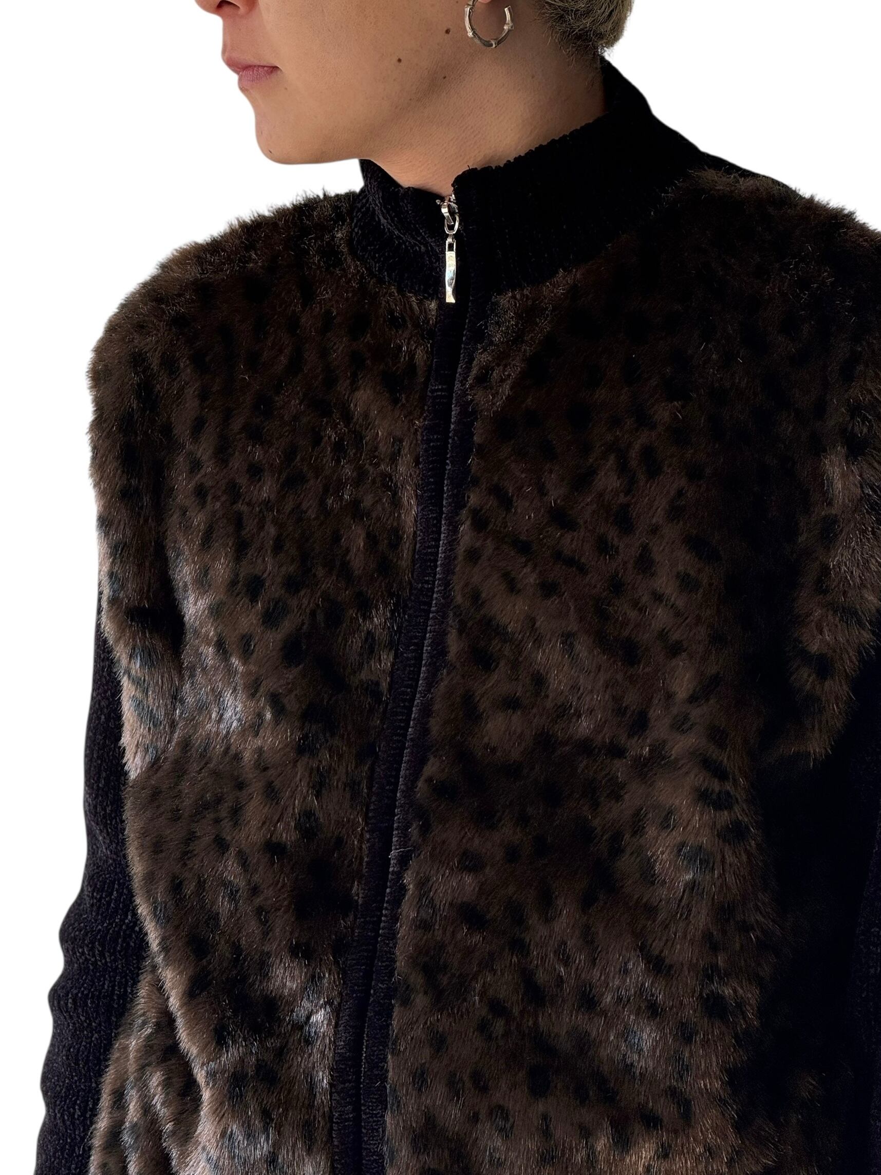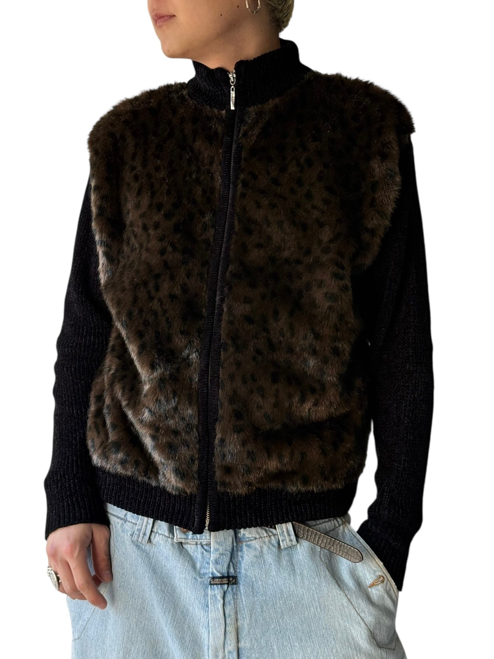 【Lisa international】Animal pattern Fur swiching Zipup knit