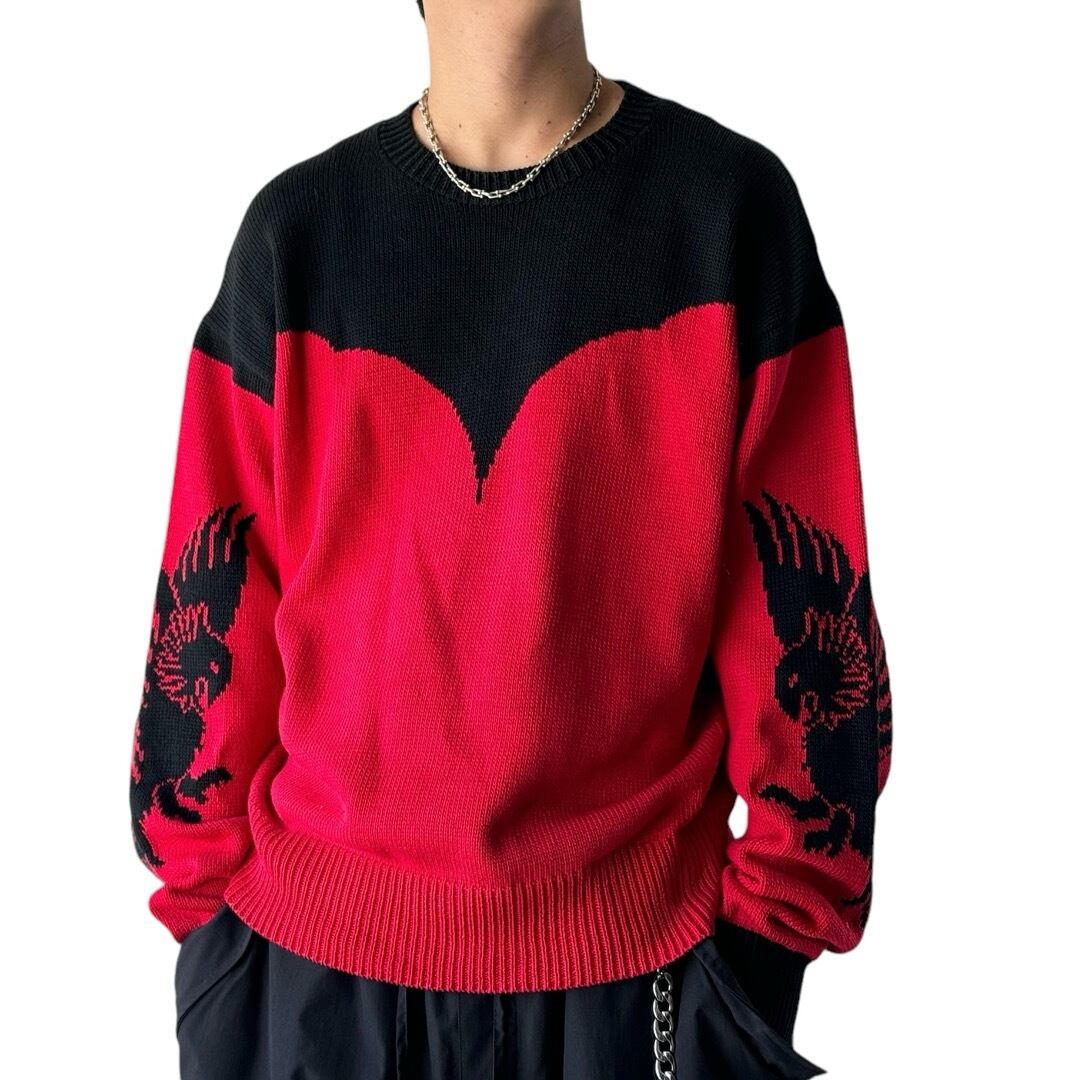ブラック×レッドが最高に映えるセパレートカラーデザインにニットには珍しい袖にイーグルが入る袖刺繍デザイン!