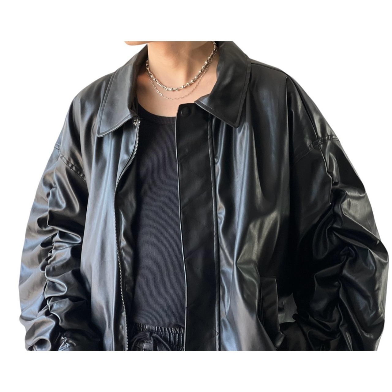 身幅のワイドなしっかりオーバーシルエットが存在感ありPUレザー特有のライトな着やすさでガバッと羽織りやすくこれかの時期のメインアウターに超オススメ‼️