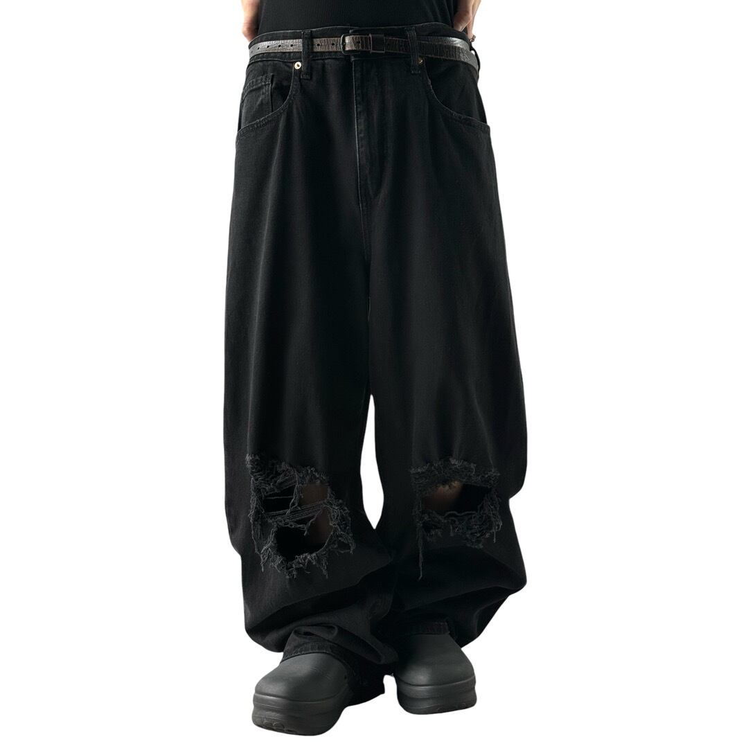 膝にワシャワシャなクラッシュ加工を施したデザインブラックデニムパンツ❗️