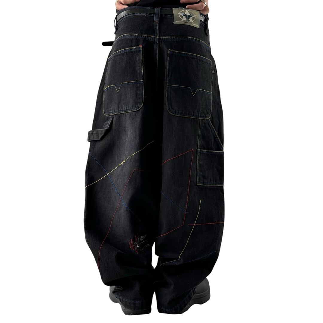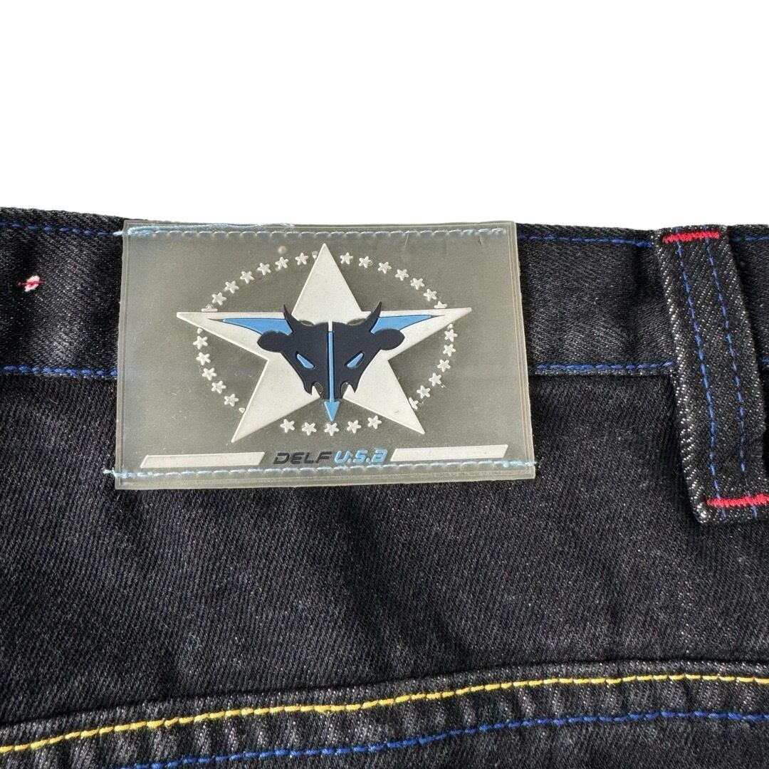 ♾DELF♾ wide buggy silhouette stitch work design black denim pants dead stock size34x32