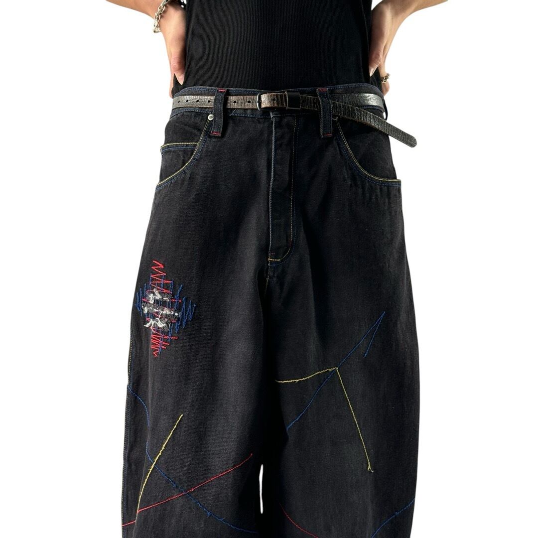 wide buggy silhouette stitch work design black denim pants