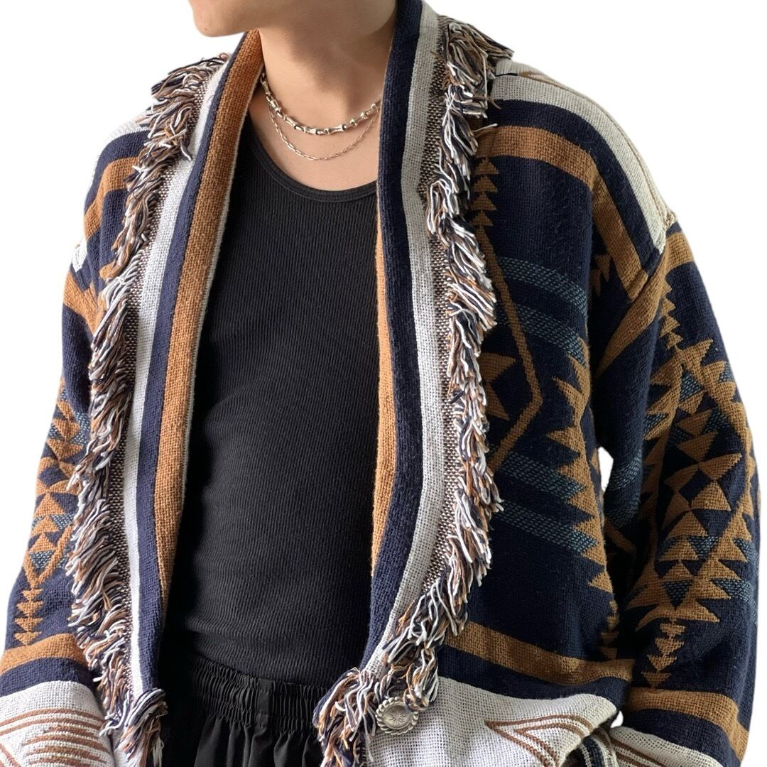 柄はもちろん荒めのザックリとした生地とフリンジが圧倒的な存在感。