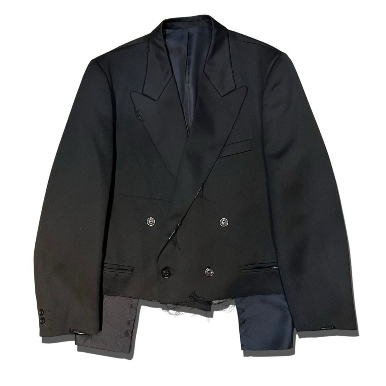 某メゾンブランドを彷彿とさせるような、迫力のあるヴィンテージのテーラードをザックリとリメイク加工でショート丈にした当店だけのオリジナル品✨