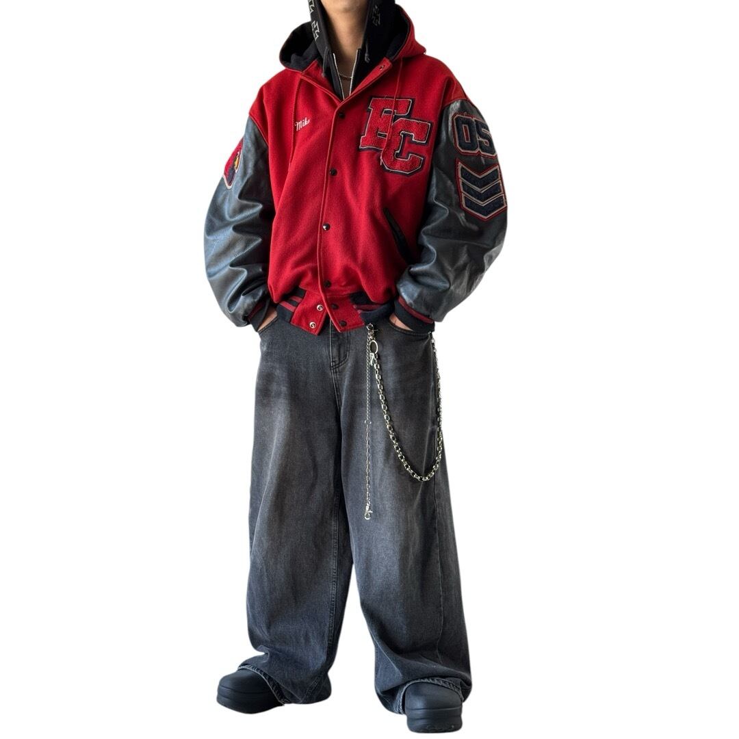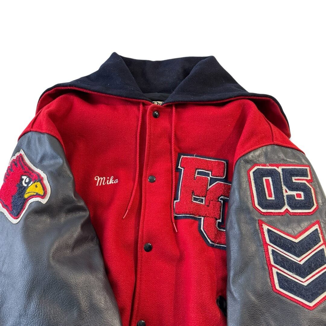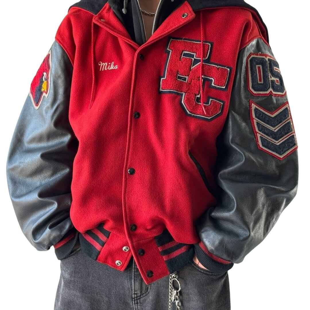 赤を基調としたグッドコントラストが目を引く配色のデザインフーディーバーシティージャケット✨️