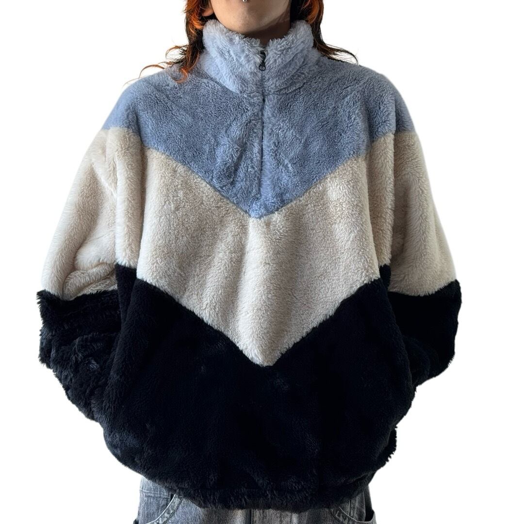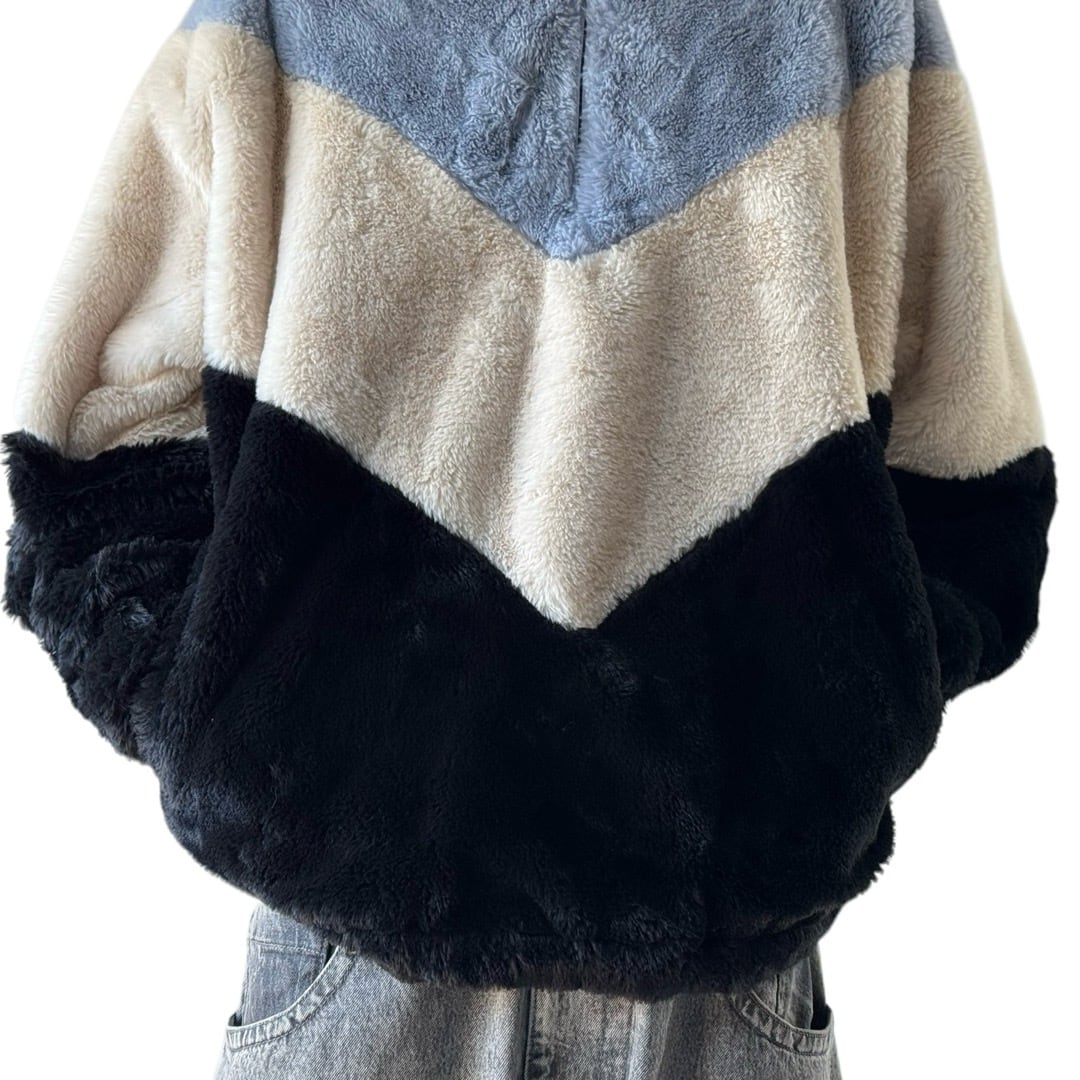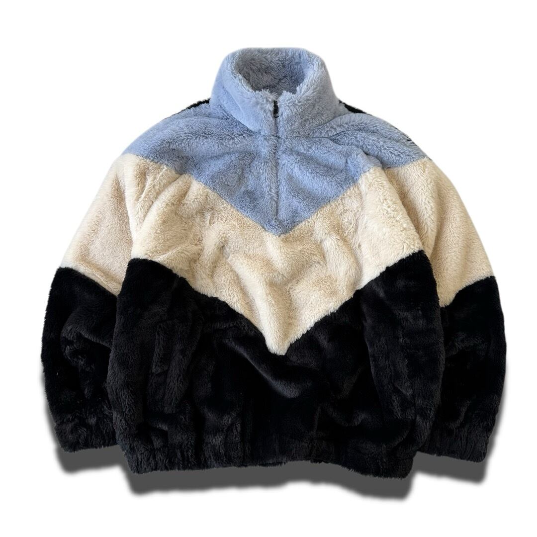 綺麗なアイスぺールブルー、ホワイト、ブラックの三色使いが特徴的かつオーバーシルエットが超優秀なフェイクファーハーフジップ!!!