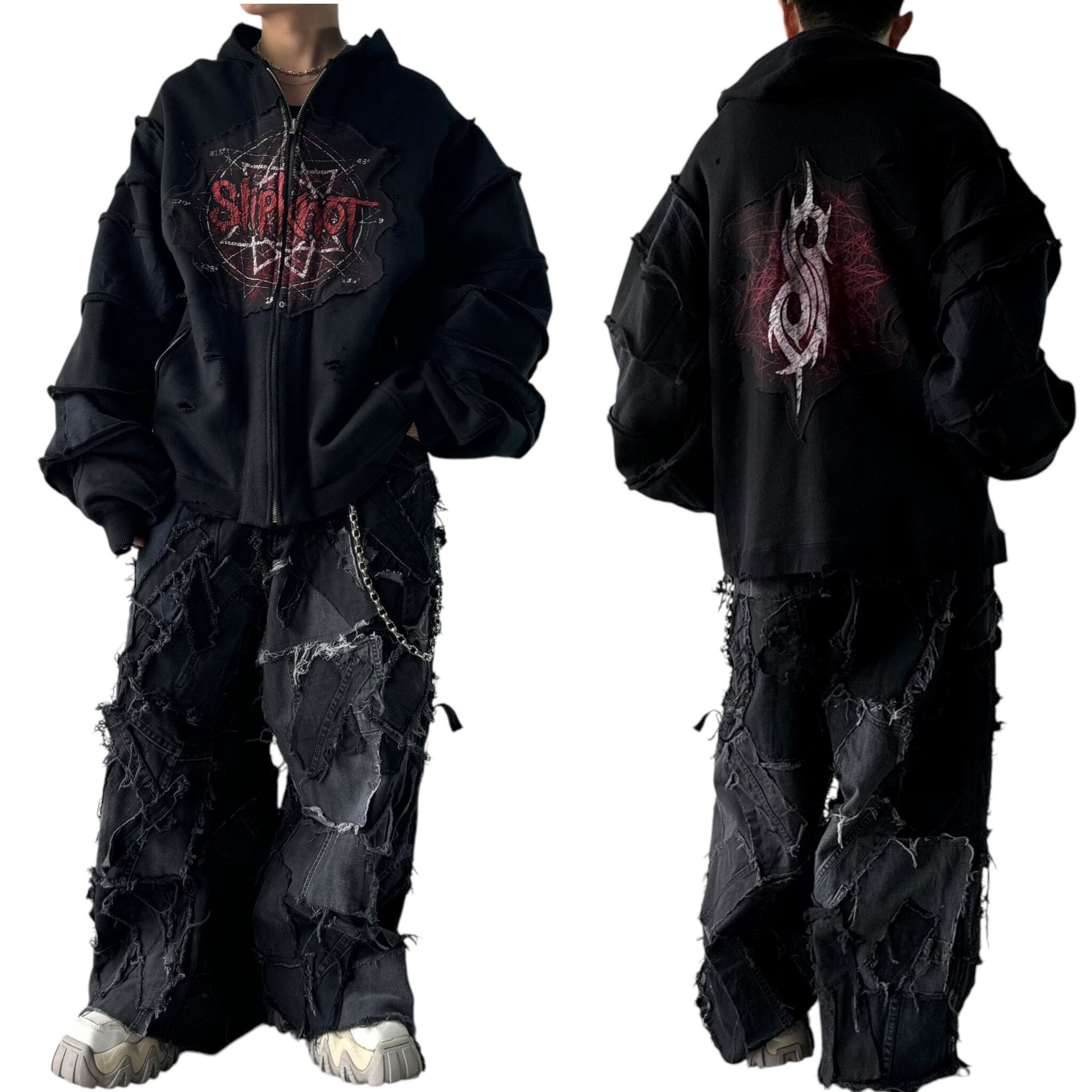 ♾ORIGINAL REMAKE♾ "SlipKnoT" remake custom sleeve over sized zip up reversible hoodie