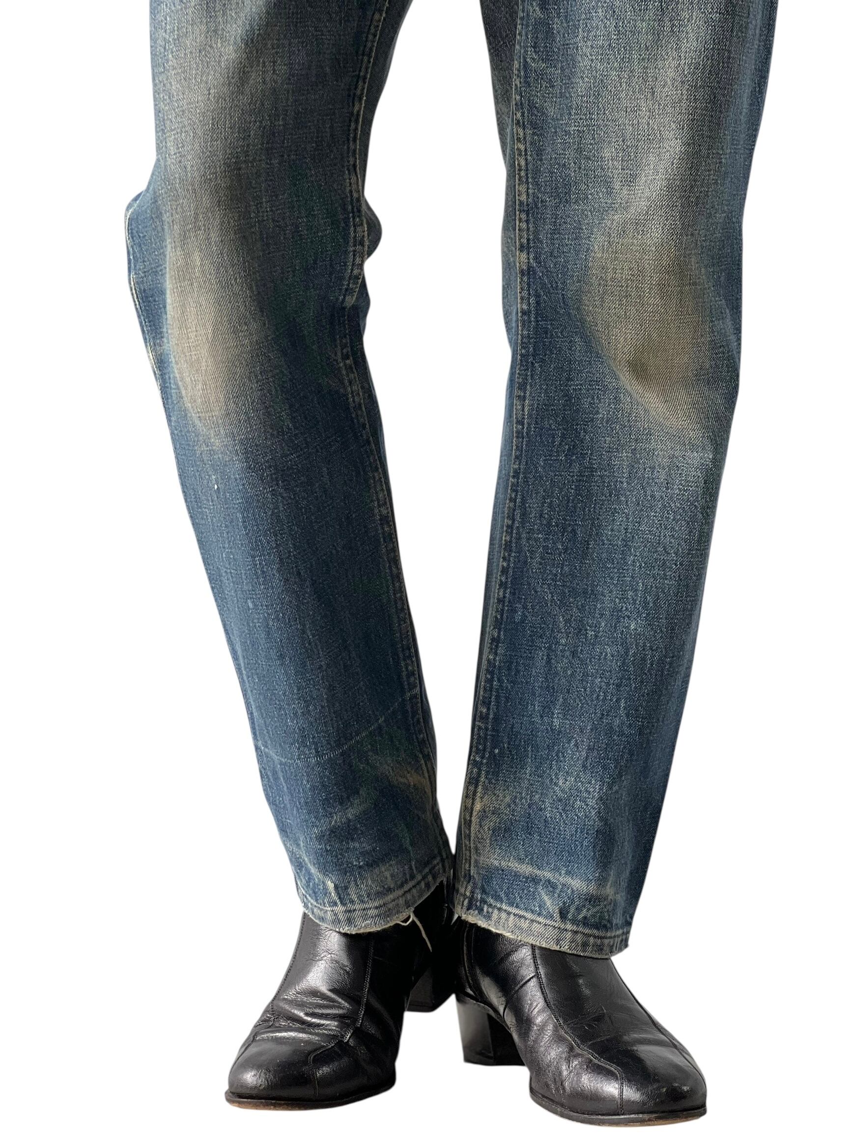 ミニマリストのラングらしいシルエットと、前者が大切に時間をかけて履いて加工のように色落ちした芸術的なフェード感、ヒゲ跡、裾の破れなどグランジ感最高な一本☝️✨
