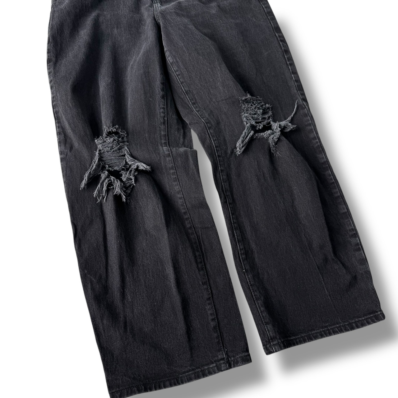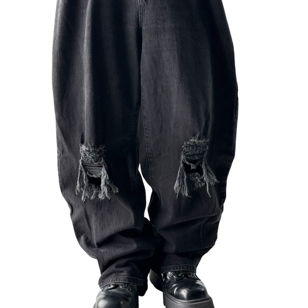 膝にワシャワシャなクラッシュ加工を施したデザインブラックデニムパンツ❗️