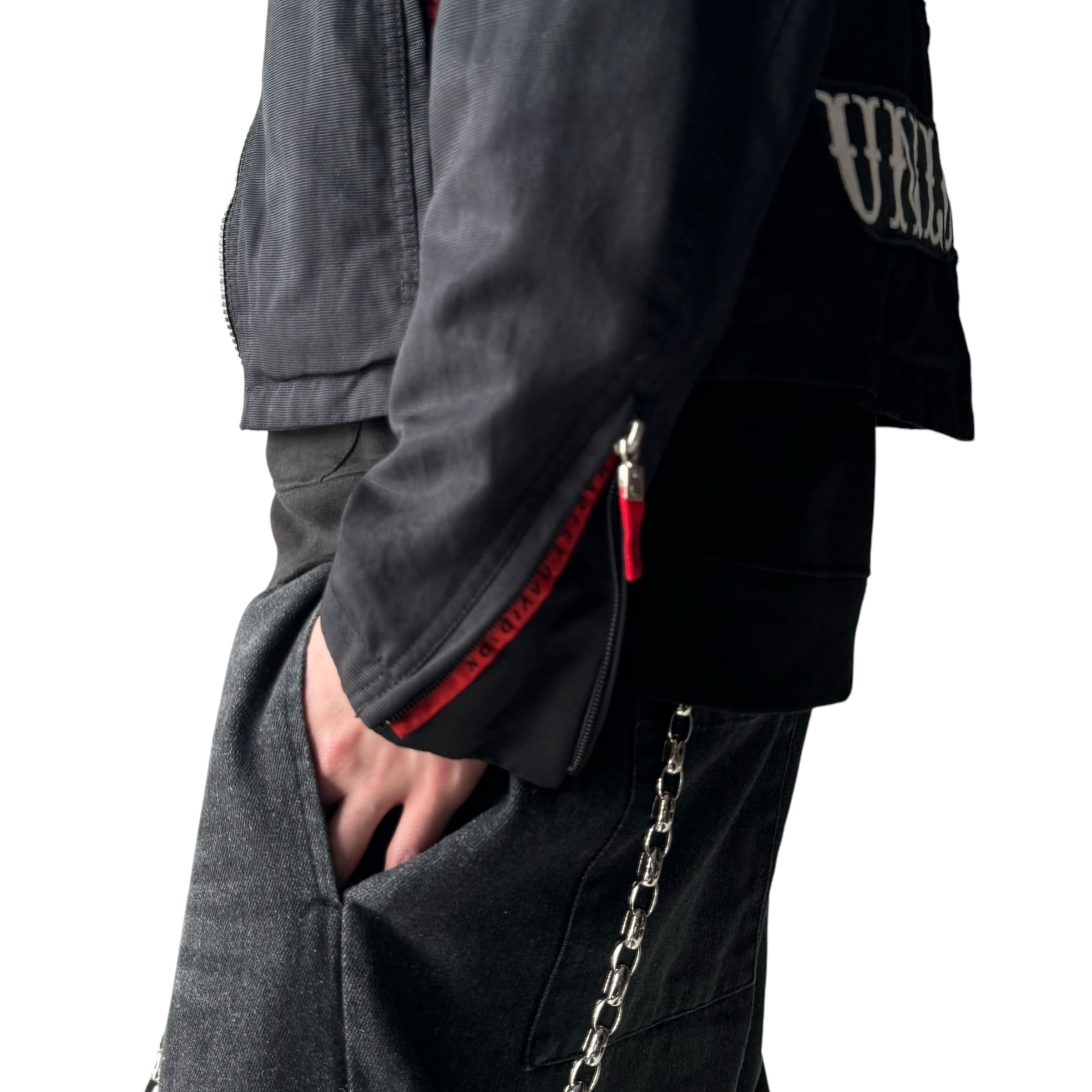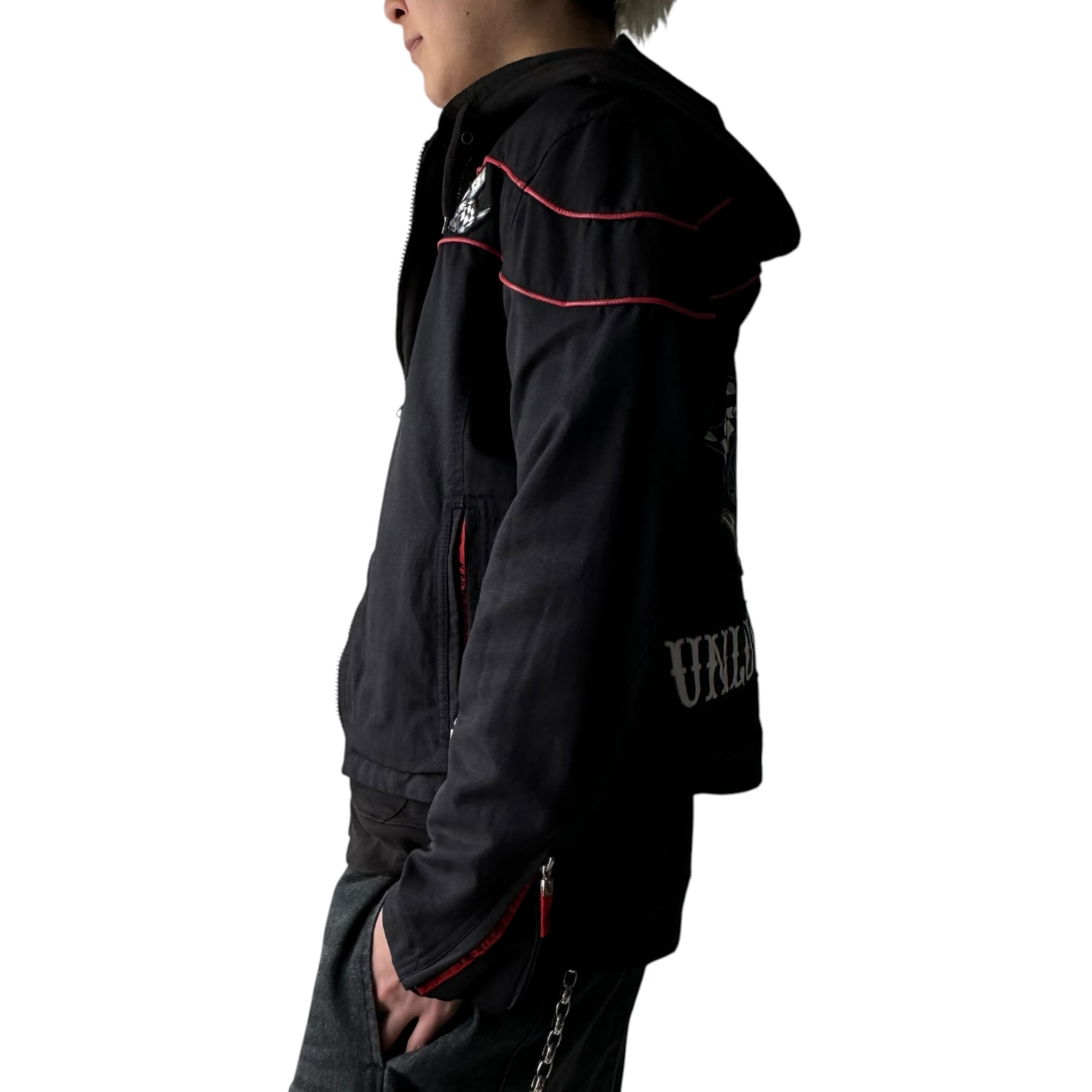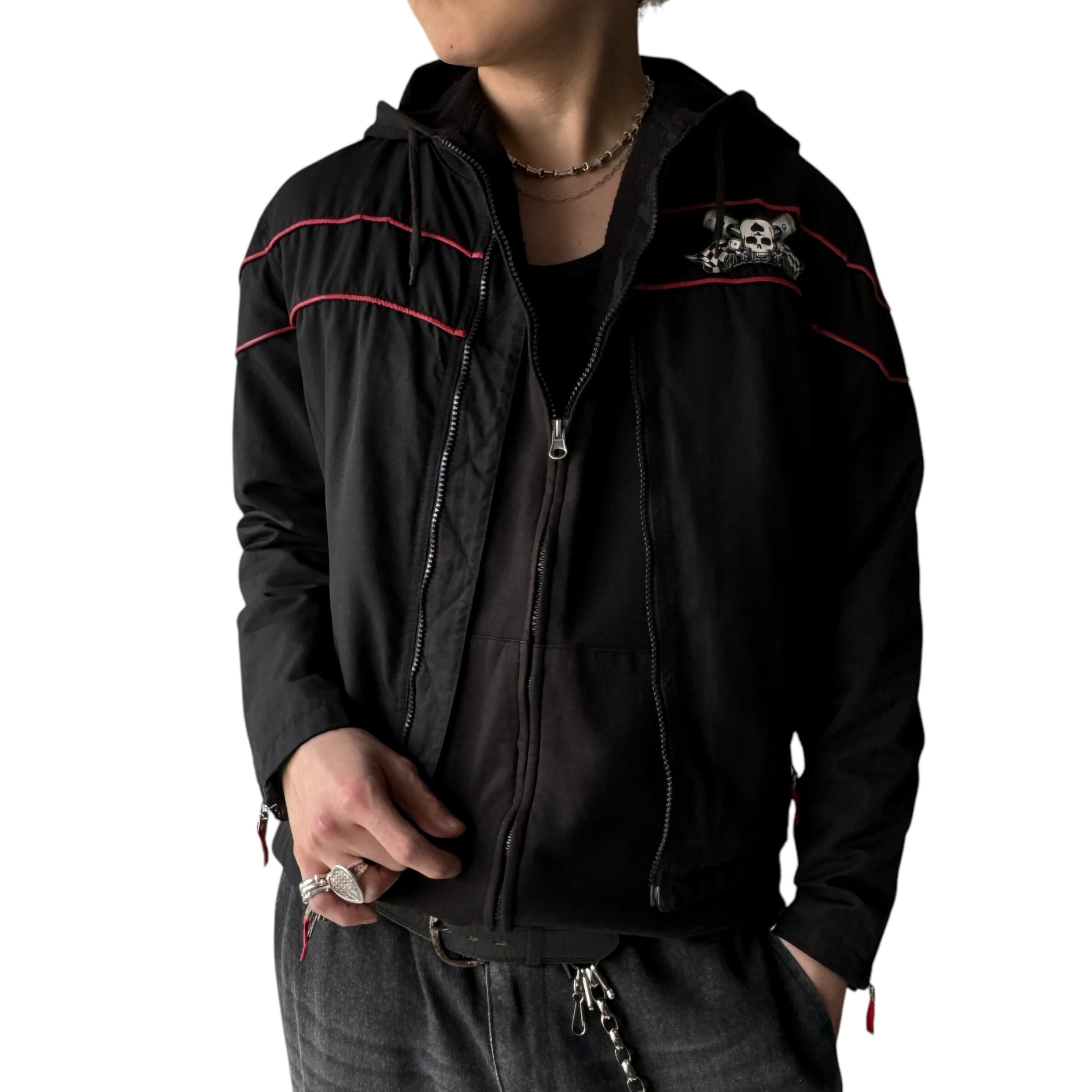 ️スカルモチーフのインパクトあるパッチカスタムデザインがハーレーらしいダブルジップジャケット‼️