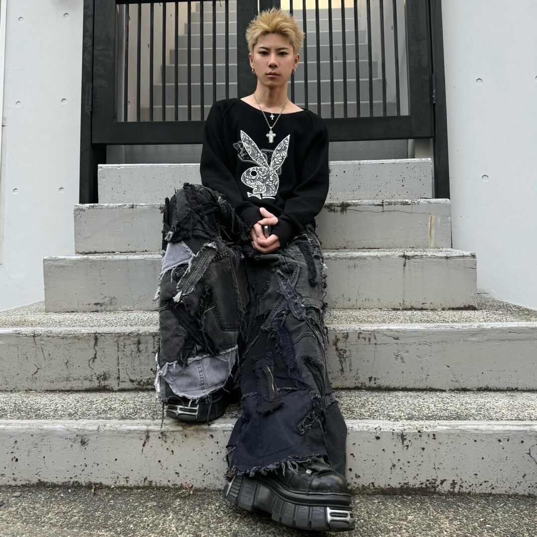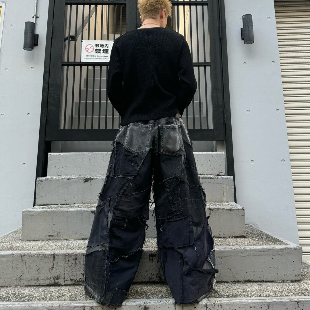 数本のデニムを足して作られているので通常ではあり得ない袴のように広がるメガワイドシルエット❗️