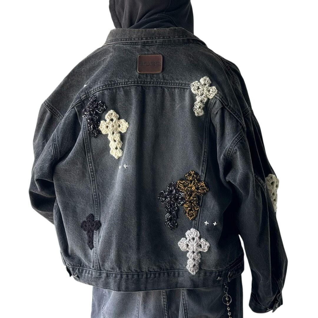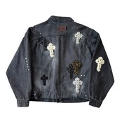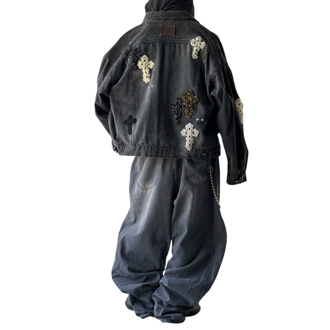 クロスモチーフのハンドカスタムデザインがオンリーなブラックデニムトラッカージャケットの入荷✨️