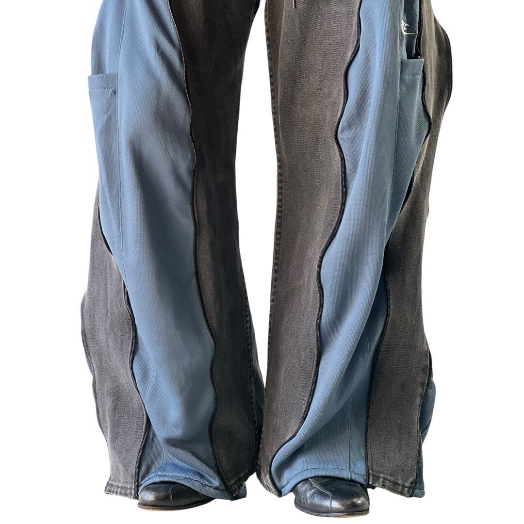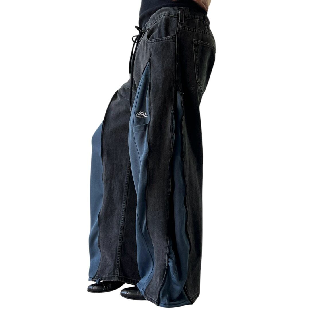 フェードしたブラックデニムとNIKEのトラックパンツを融合した唯一無二のリメイクパンツ✨